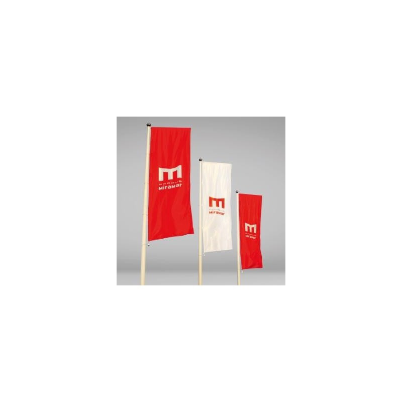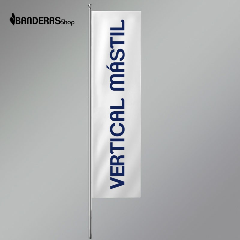 Bandera publicitaria vertical, Tela 100% poliéster 115g/m2, especial para exterior. Vaina cerrada arriba. Cinta de refuerzo, Ollaos en el lateral izquierdo cada 100cm.