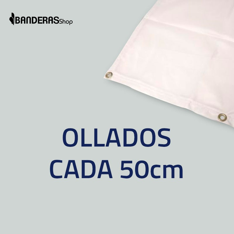 Pancarta horizontal ò vertical con cinta de refuerzo perimetral y ollado cada 50 cm. Tela 100% poliéster, 115g/m2, especial para exterior. Impresa por sublimación.
